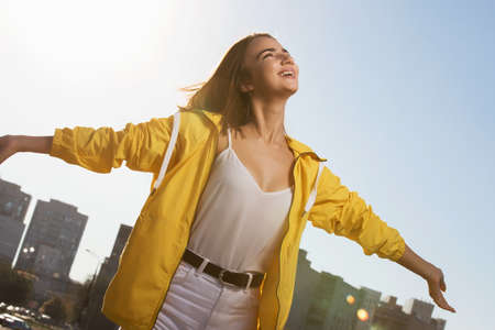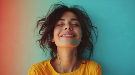 A joyful woman radiates happiness as she stands outdoors under the sunlight. Her flowing hair dances in the breeze, capturing a moment of pure delight.