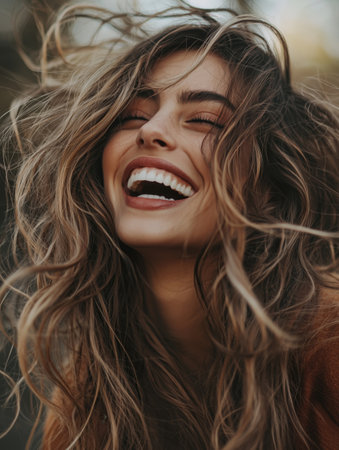 Joyful carefree woman with windblown curly brown hair laughing and embracing the outdoor environment female model expressing happiness and energy in a natural setting
