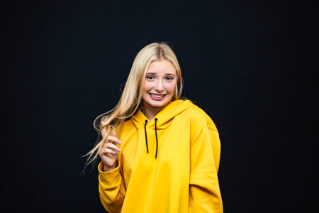 Portrait of a girl with long blonde hair in a yellow jacket, smiling, close-up.