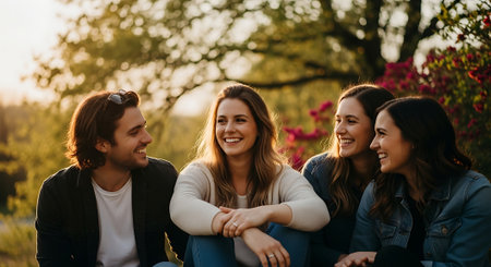 Four friends sit together in a park, smiling and enjoying each other's company, surrounded by trees and flowers during sunset.