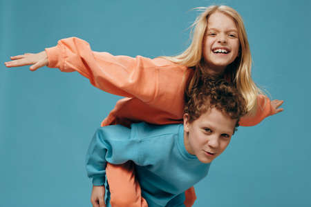 happy joyful children, brother and sister of school age play together and the boy rolls the girl on his back. Horizontal studio photography on a blue background