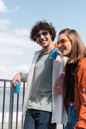 young couple in stylish clothes and sunglasses standing with soda cans outdoors
