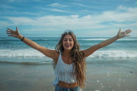 Young woman at beach embracing freedom, enjoying leisure time and happiness outdoors