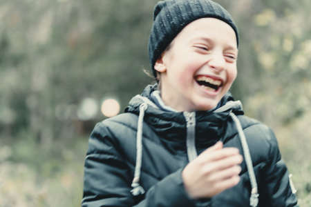 Laughing teenage girl with curly hair in the street