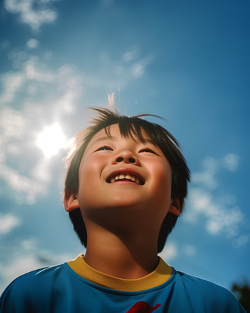 Portrait of asian boy with blue sky and sun background.