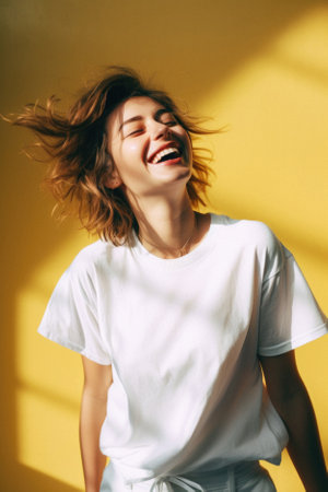 A woman is shown smiling with joy, dressed in casual attire. The image highlights a bright indoor setting, illuminated by natural light. The composition features a clean background with the subject as the central focus. Suitable for diverse commercial and editorial applications, emphasizing positive emotions and lifestyle themes.