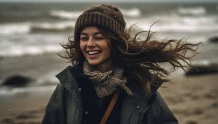 Young women feel the cold wind on the beach. Generative AI
