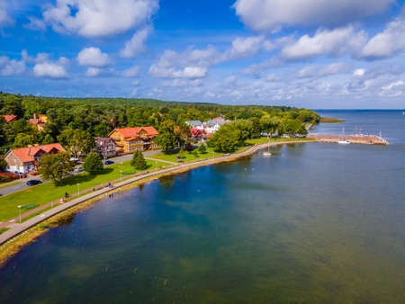 Aerial view of church in small Juodkrante fisherman city in Curonian spit