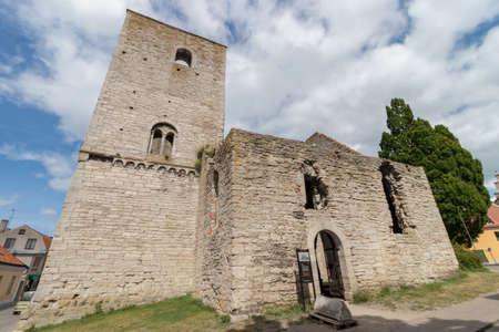 VISBY, SWEDEN - JULY 27, 2020: Beautiful summer city view of an old ancient church ruin with incidental people in the foreground in the city of Visby Gotland Sweden July 27, 2020.