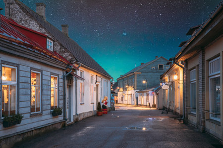 Kuressaare, Estonia. Houses At Kauba Street In Evening Or Night Illuminations. Old Traditional Houses On Narrow Street. Amazing Bold Bright Blue Starry Sky Gradient Above Houses. Azure Sky Background