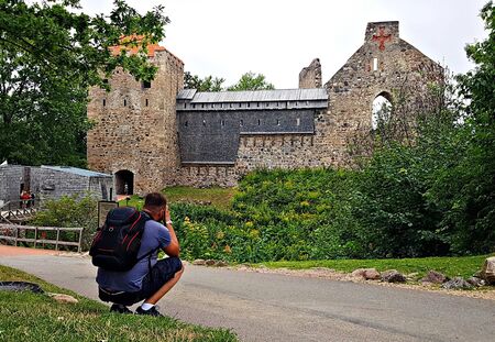 Tourist photographs the preserved ancient walls of Sigulda Castle. Sigulda, Latvia, July 2019.