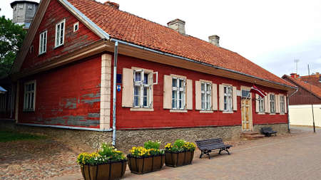Wooden house with a red tiled roof in the Latvian city of Kuldiga on July 4, 2020.