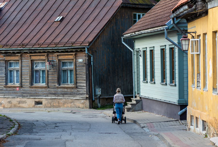 A woman with a baby carriage walks through the old town of C?sis, Latvia.