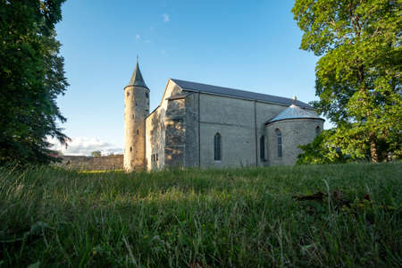 Beautiful rural summer view of an ancient medieval brick tower and defense wall surrounding the city of Visby Gotland, Sweden. Blue sky and grassy fields.