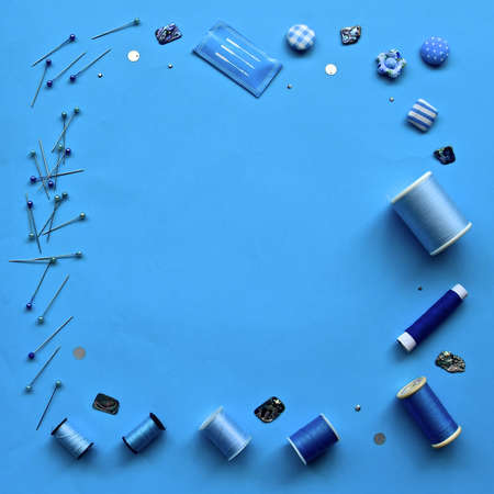 A birds eye flatlay of sewing accessories with cotton, hooks and eye fasteners, pins and buttons on a blue background.