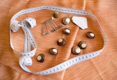 Measuring tape with collection of sewing items used by a seamstress to make clothes