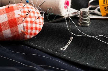 Old retro tailor's tools for sewing clothes. Centimeter, scissors, thimble and needle with snitch.