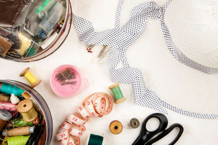 Sewing supplies and accessories for needlework. Fabric, spools of thread, scissors and thimbles on white background.