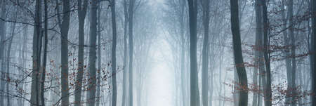 Strange fall forest with magical atmosphere panoramic picture. Mystical dreamy forest in autumn and magical light wide photo