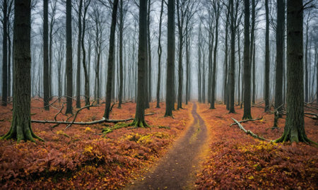 Dense forest shrouded in heavy fog creates an eerie and atmospheric scene with tall trees lining a path Perfect for illustrating mystery or nature's solitude.