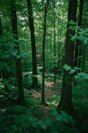 A forest scene showcases tall trees and a pathway winding through lush vegetation. The image displays a natural environment with vibrant green foliage and sunlight filtering through the canopy. This photograph could be used for various purposes, including editorial content, nature documentaries, or environmental illustrations.
