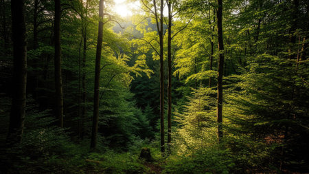 Tranquil scene of a vibrant forest with a mysterious wilderness generated by artificial intelligence