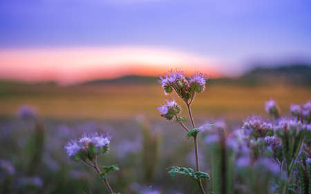 Agricultural fields with flowering phacelia. Beautiful landscape on a sunset. Flowers for bees, beekeeping. Phacelia tanacetifolia.