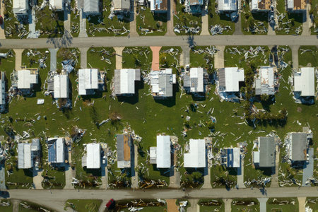Hurricane destroyed suburban houses roofs in Florida mobile home residential area. Consequences of natural disaster