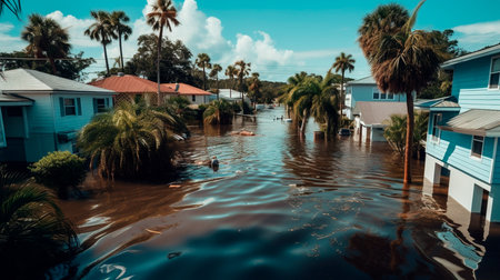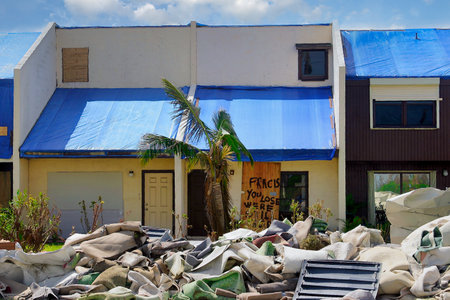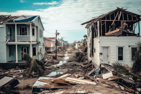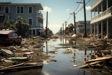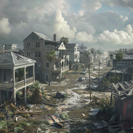 A hurricane damage coastal town debris broken street destruction palm tree cloudy sky