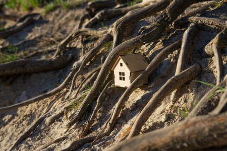 Tiny toy house standing among large and strong tree roots on a sandy shore. Family home concept.