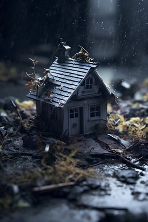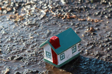 Small toy house in the rain.