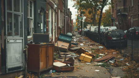 A cluttered urban street filled with discarded furniture and debris, highlighting the impact of economic recession and urban decline amid autumn foliage.