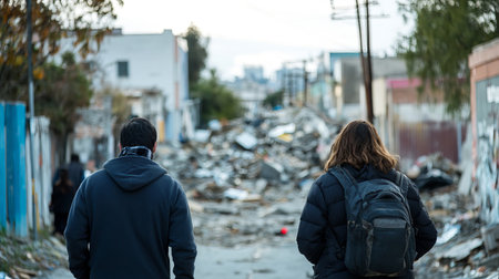 Two people traverse a debris-filled street in their neighborhood, capturing the anxious atmosphere post-aftershock as tension hangs in the air.