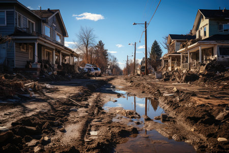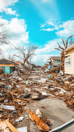A residential area devastated, with damaged homes and debris-laden street