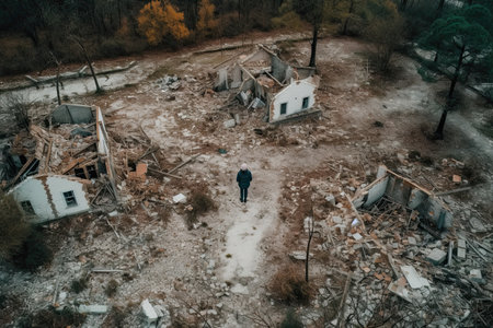 A lone person contemplates the wreckage of destroyed buildings, set against a mountainous backdrop