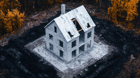 An aerial view of an abandoned concrete house under construction, showcasing a missing roof and surrounded by vibrant autumn foliage, symbolizing neglect and decay.