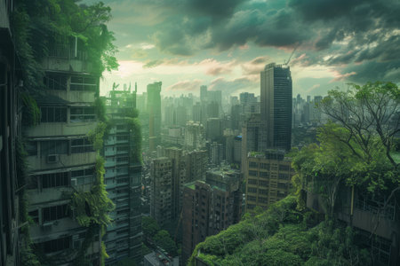 City filled with tall, looming buildings under a cloudy sky, A post-apocalyptic city skyline, with crumbling buildings and overgrown vegetation reclaiming the urban landscape