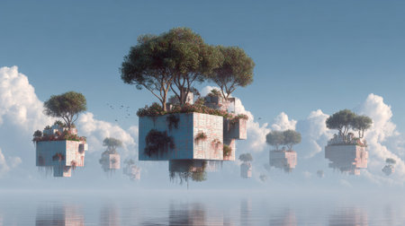 Explore a captivating scene of floating islands featuring lush trees and vibrant plants, set against a backdrop of clear skies and fluffy clouds.