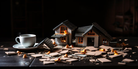 House model and broken dishes on black table depicting destruction after earthquake. Space for text : Generative AI