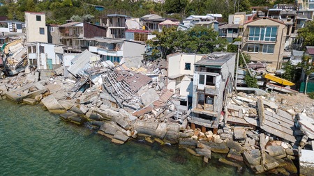 The destroyed house after the earthquake on the seashore