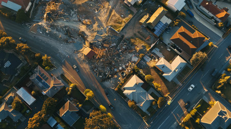 Urban area destroyed by an earthquake, homes reduced to rubble and debris-littered streets.