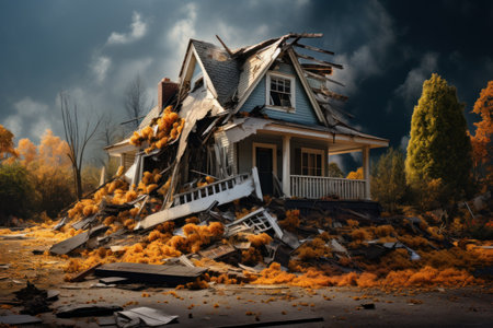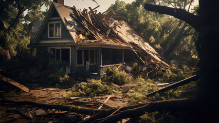 house destroyed by tornado at sunset near the sea illustration generative ai art