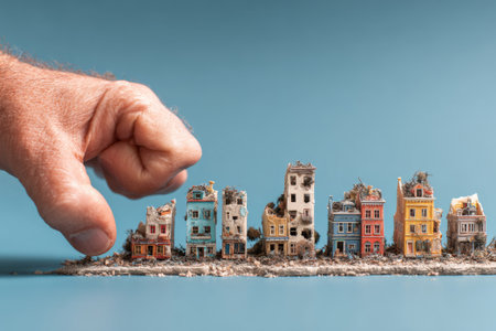 Giant fist is menacing a miniature row of colorful destroyed buildings, evoking themes of urban decay and fragility