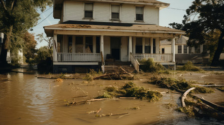 an abandoned house in the middle of nowhere, surrounded by rubbles and debris from hurricane katrinas aftermath. Generative Ai