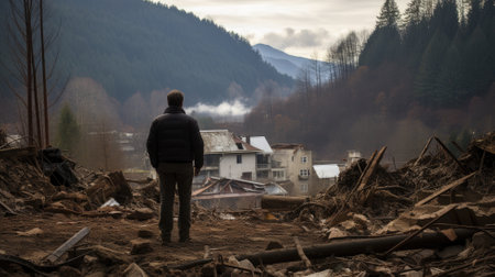 A house stands damaged amidst debris after a limnological catastrophe, with a person in the foreground