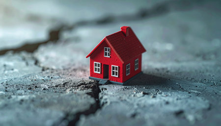 Miniature house model sitting atop cracked ground, symbolizing destruction caused by seismic event and fragility of residential structures during natural disasters