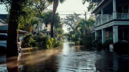 a flooded street in a residential area with houses and palm trees
