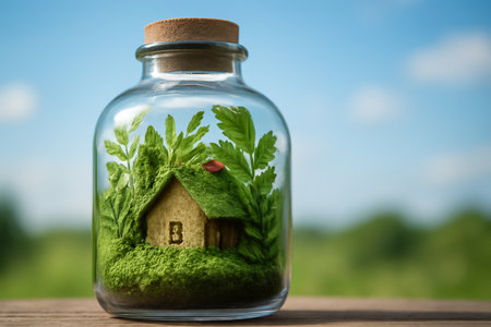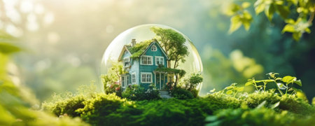 AI generated image of a glass terrarium featuring a wooden house surrounded by lush greenery. The scene emphasizes the beauty peaceful vibes, ideal for environmental conservation themes.