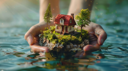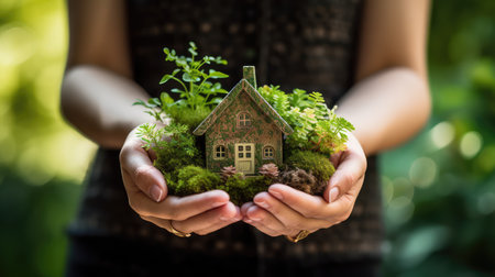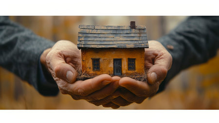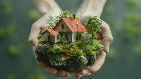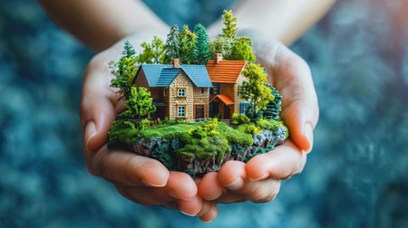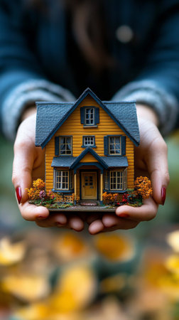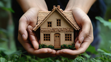A pair of hands gently cradle a miniature house model, showing intricate details. This moment captures the essence of home ownership, dreams, and comfort.