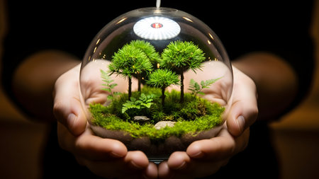 A hand holding a light bulb filled with soil and moss, symbolizing the connection between innovative energy solutions and environmental sustainability.